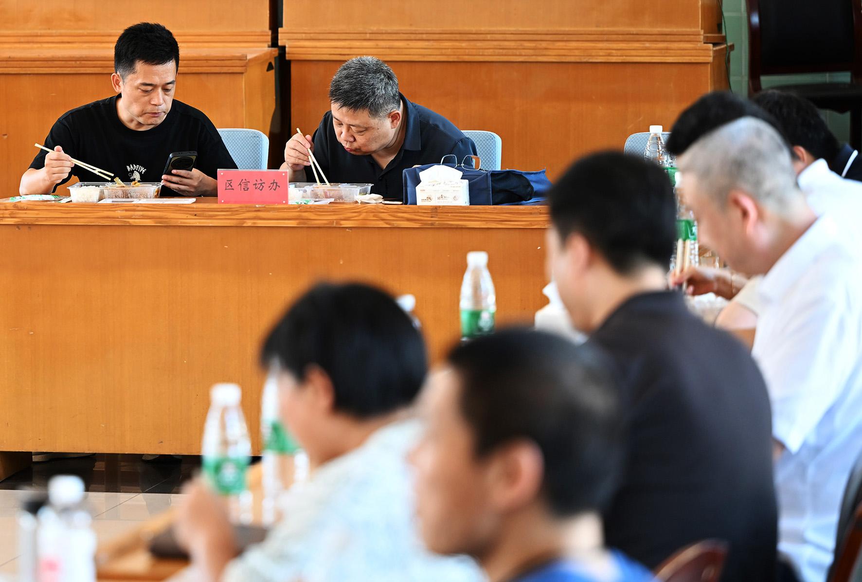 8月6日12時(shí)30分,忙碌了一上午的臨時(shí)“綜治中心”工作人員在辦公桌邊吃盒飯,邊商量著村民反映問(wèn)題的解決辦法。