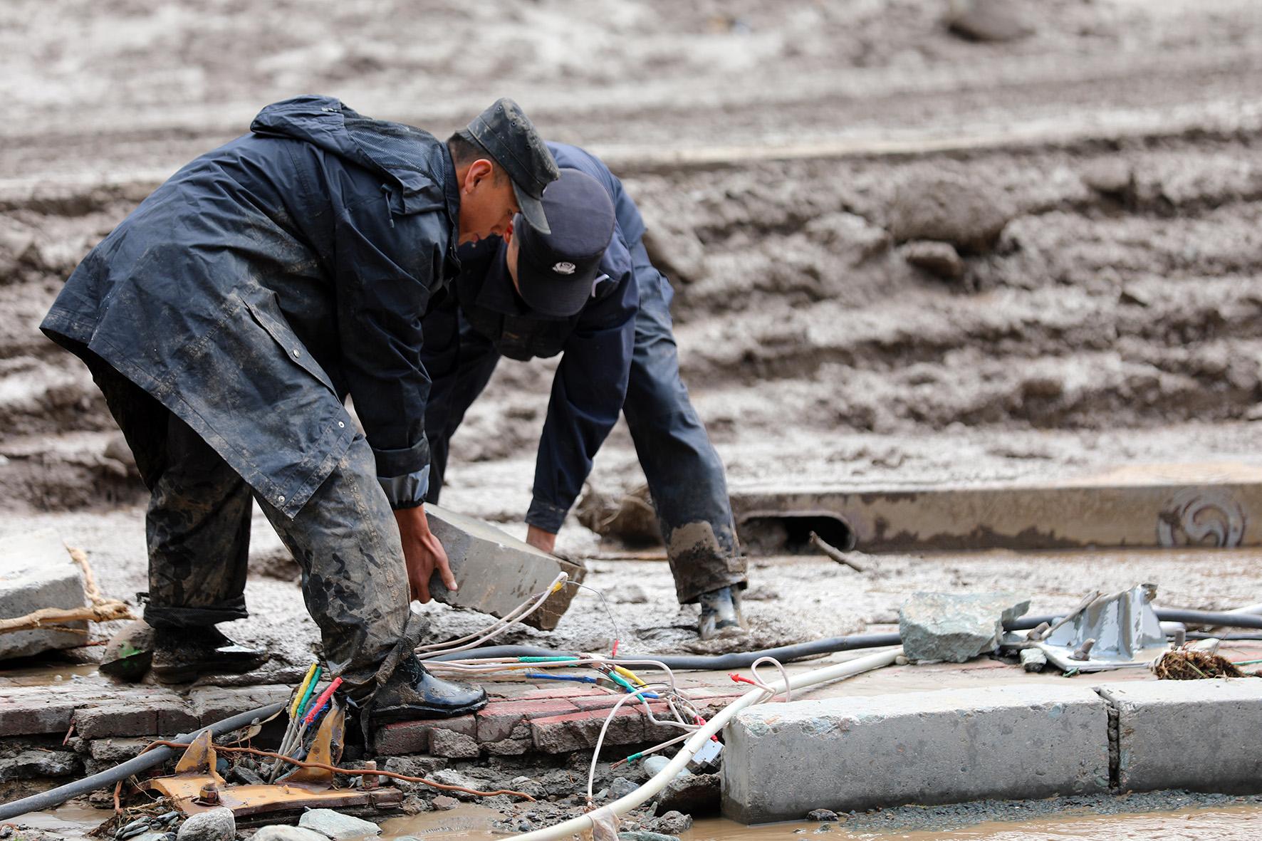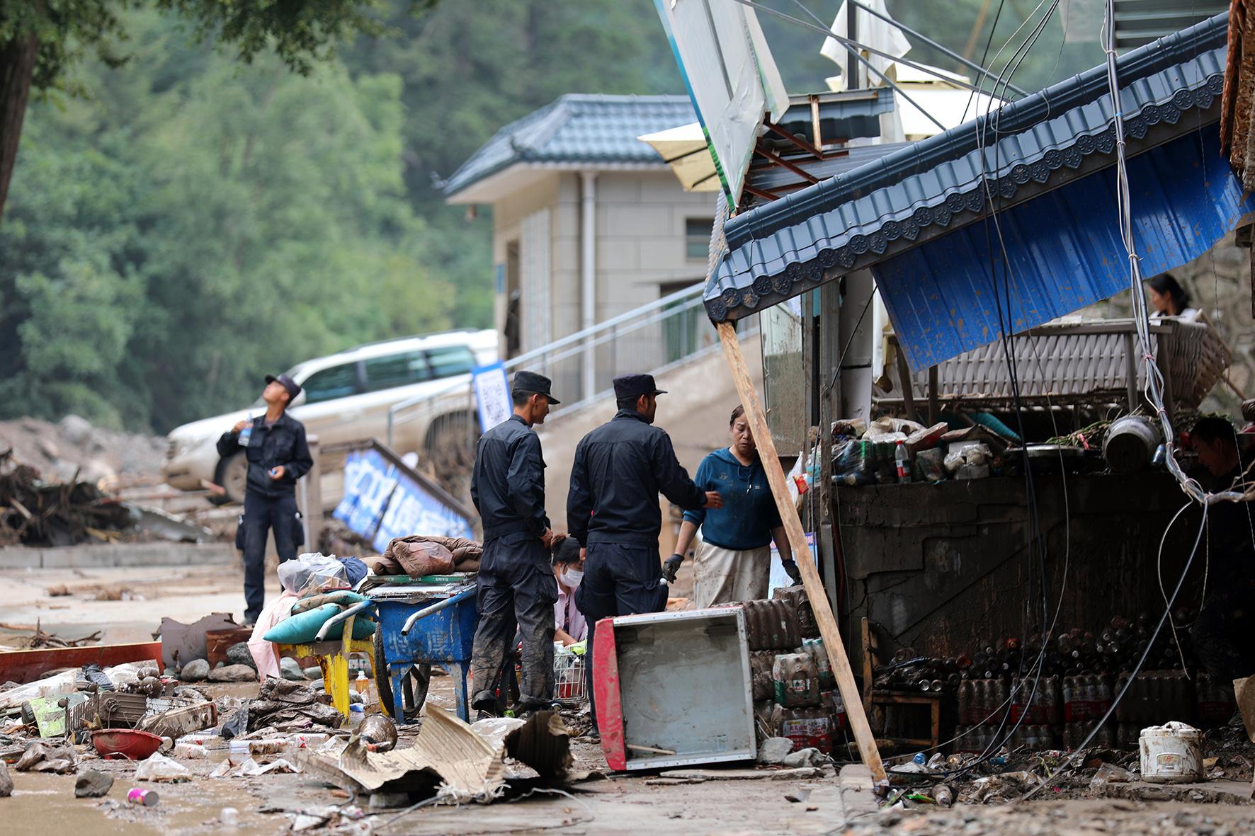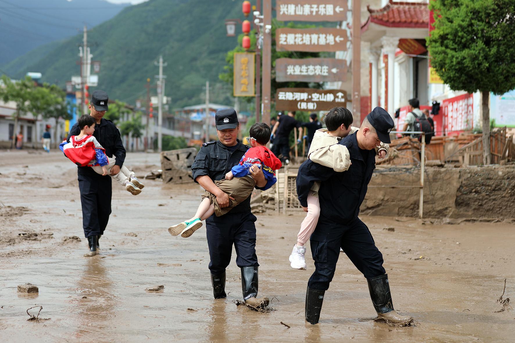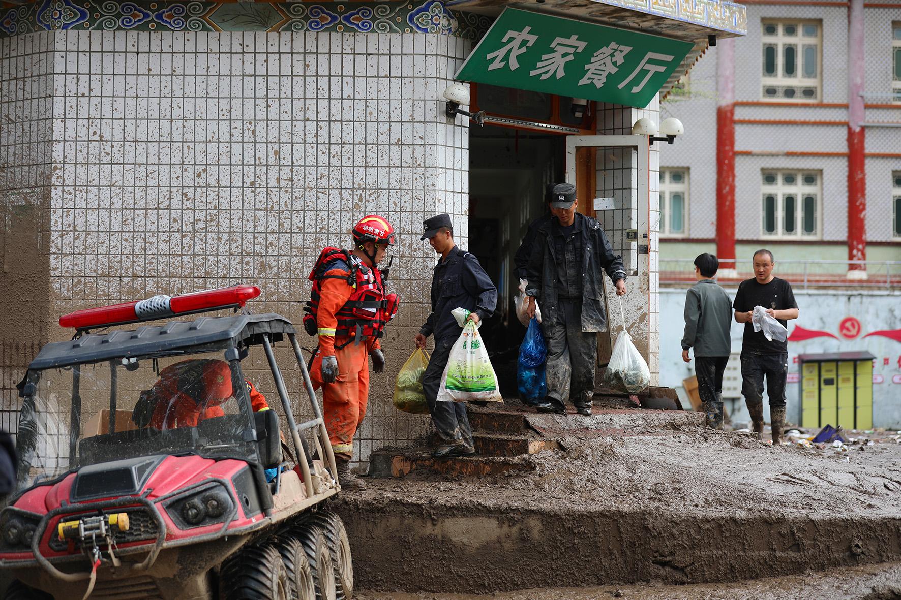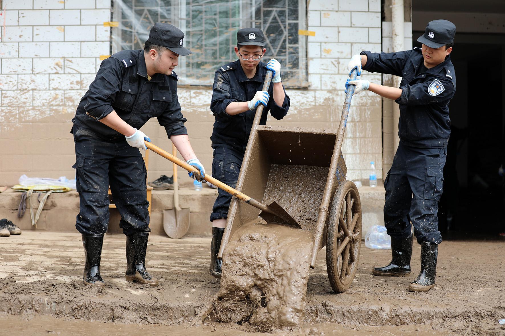 8月9日,甘肅省蘭州市公安局民輔警持續(xù)奮戰(zhàn)在榆中縣救災一線,全力開展受災群眾轉移安置、重要物資搶運等工作。
