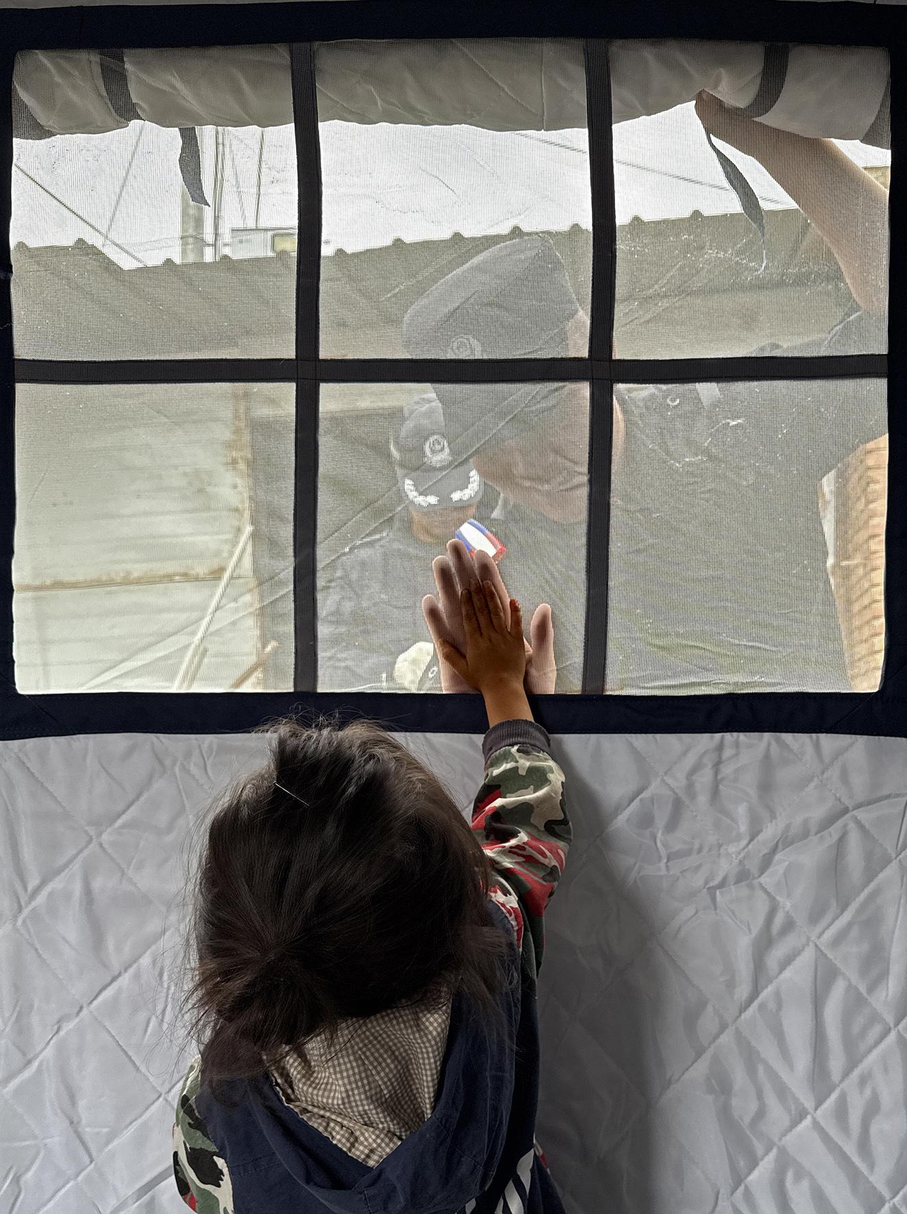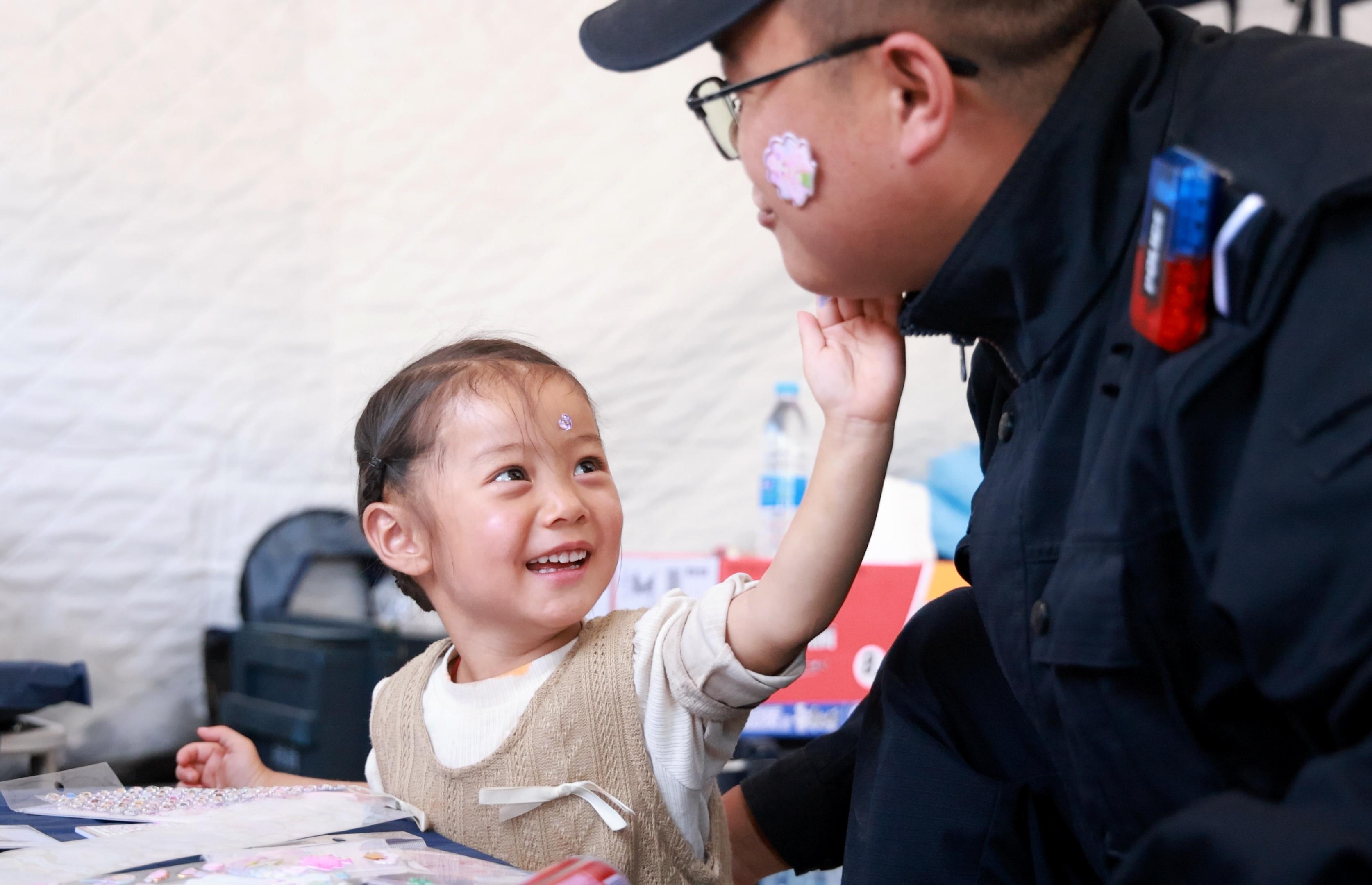 8月14日,瑤瑤在帳篷里給輔警張云峰臉上貼貼紙。金萬貴 攝