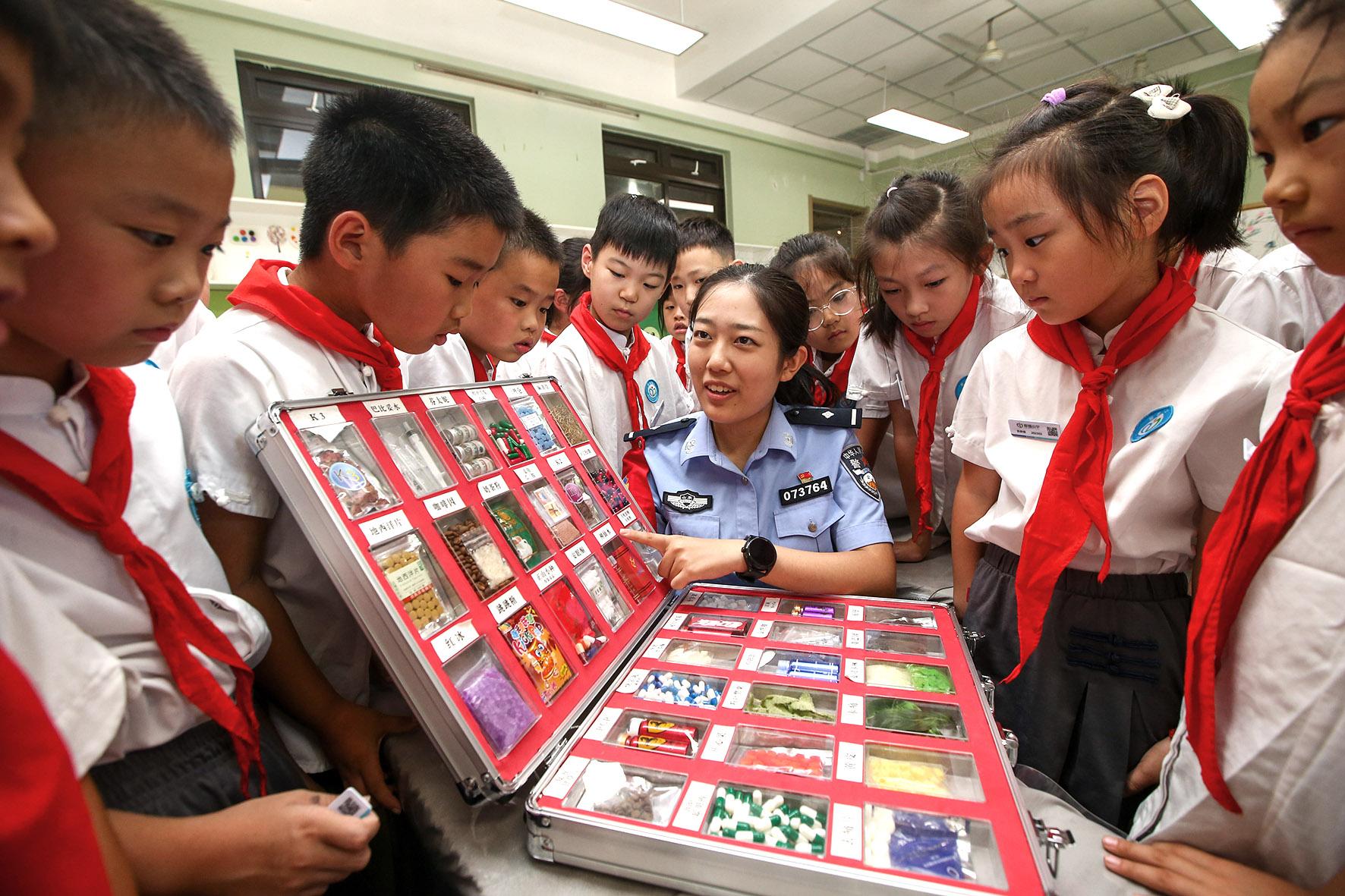 9月1日,山東省濟(jì)南市公安局市中分局民警來(lái)到愛都小學(xué)利用仿真毒品模型給學(xué)生講解禁毒常識(shí)。