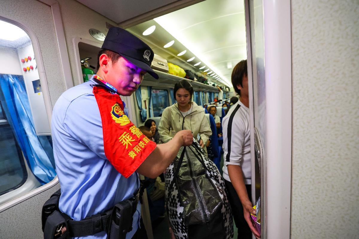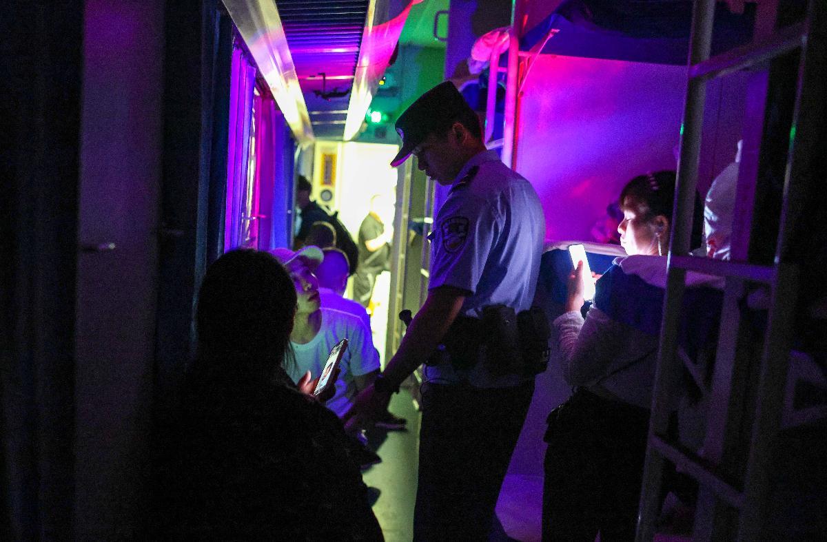 10月14日,劉濤在K845次列車臥鋪車廂開展夜間巡查時(shí)提示旅客保管好貴重物品。