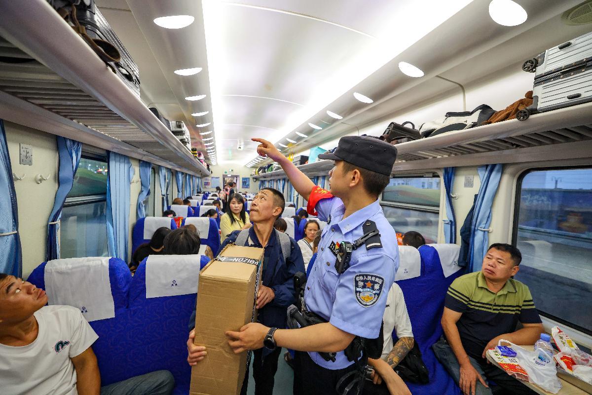 10月14日,劉濤在K845次列車上指導(dǎo)旅客安全擺放行李。