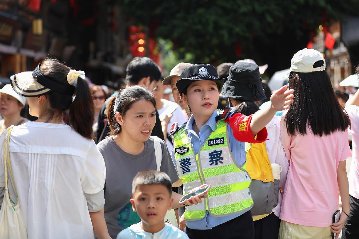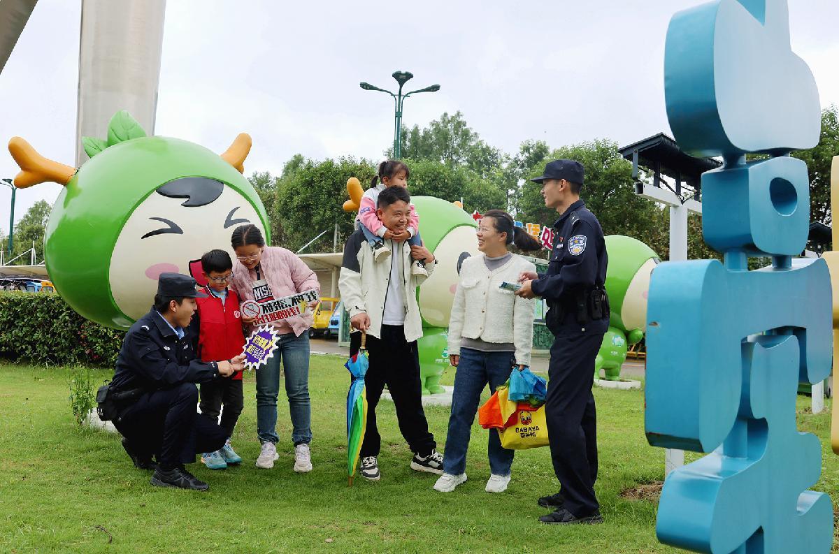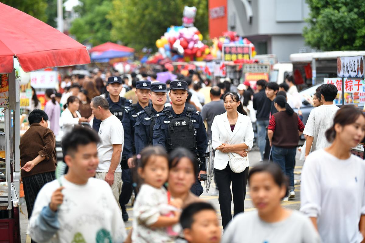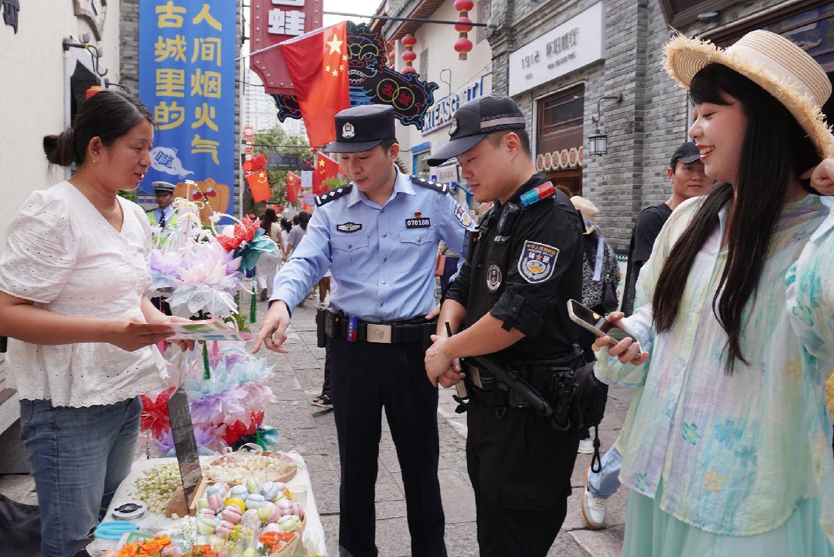 10月1日,安徽省蕪湖市公安局鏡湖分局民輔警在古城景區(qū)巡邏執(zhí)勤,并向游客進(jìn)行反電詐宣傳。