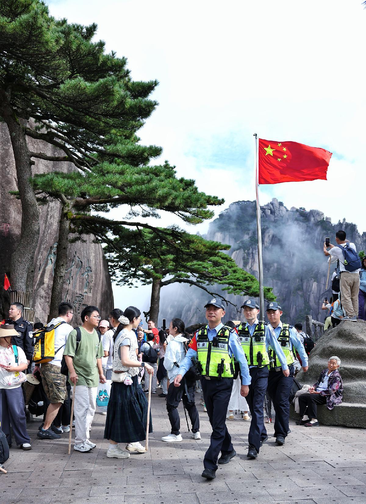 10月1日,安徽省黃山風(fēng)景區(qū)公安局玉屏樓派出所執(zhí)勤民輔警在迎客松前巡邏。
