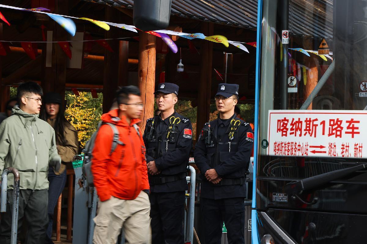 10月2日,新疆阿勒泰邊境管理支隊(duì)喀納斯邊境派出所民警在喀納斯景區(qū)換乘中心執(zhí)勤。