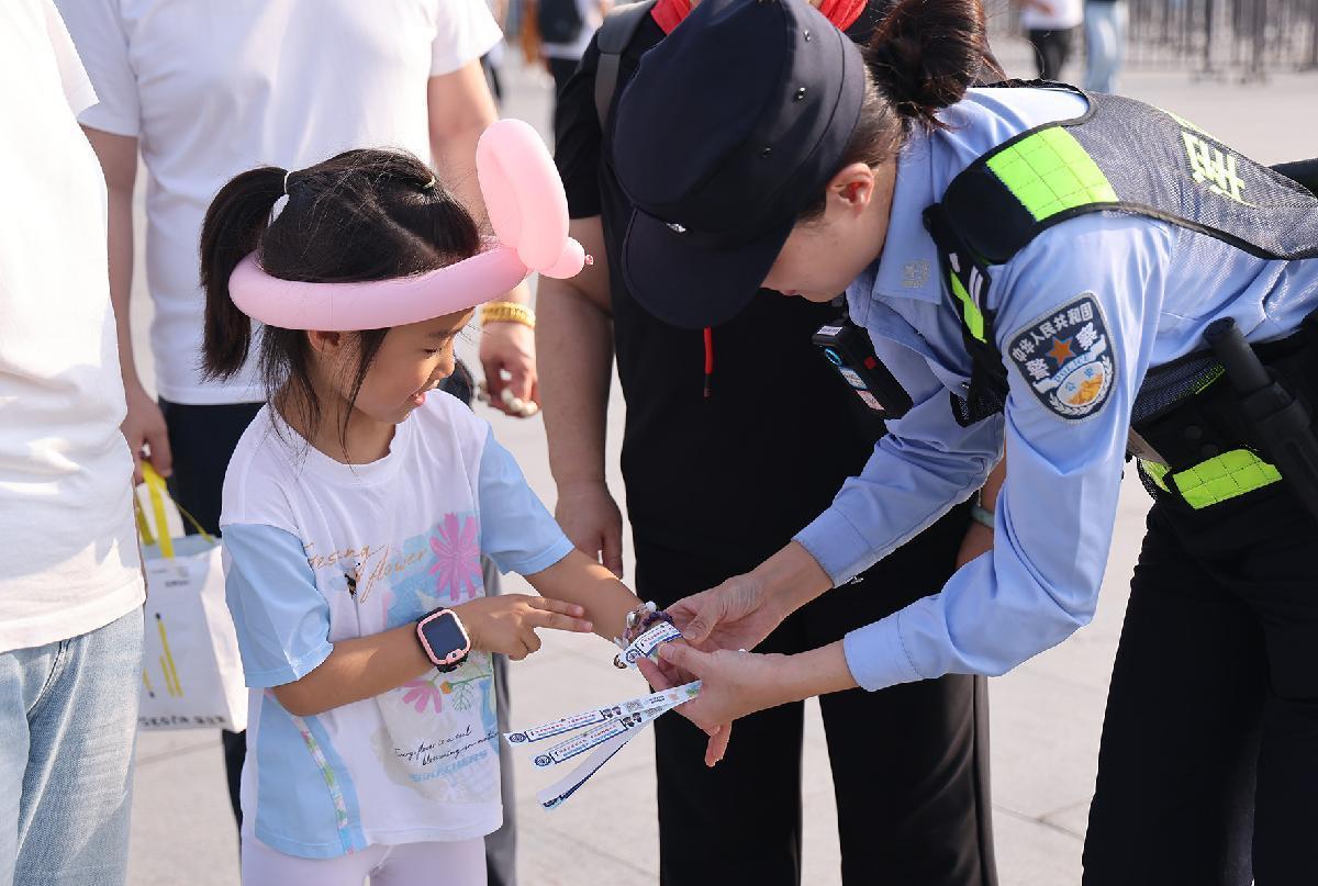 10月1日,遼寧省沈陽市公安局渾南分局民警為小朋友佩戴防走失手帶。