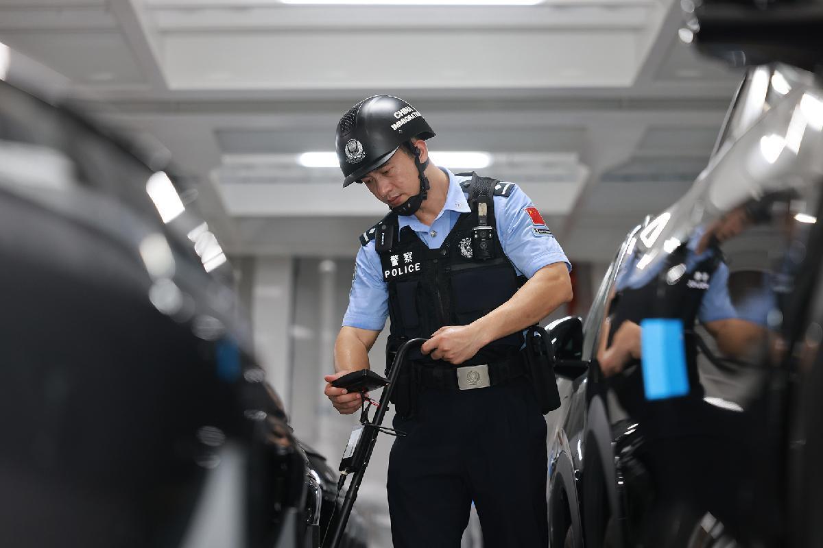 10月2日,江蘇邊檢總站太倉邊檢站民警對(duì)出口汽車進(jìn)行查驗(yàn)。