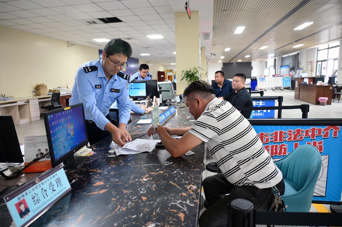 10月1日,安徽省固鎮(zhèn)縣公安局交管大隊(duì)民輔警在車管大廳為群眾辦理車駕管業(yè)務(wù)。