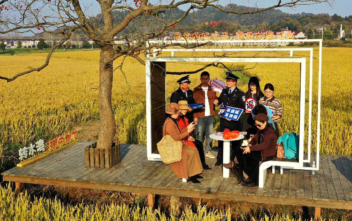 11月13日,安徽省舒城縣公安局網(wǎng)監(jiān)大隊聯(lián)合闕店派出所走進(jìn)轉(zhuǎn)水灣村“稻田樹下”打卡點,向游客和村民開展打擊整治網(wǎng)絡(luò)謠言宣傳。