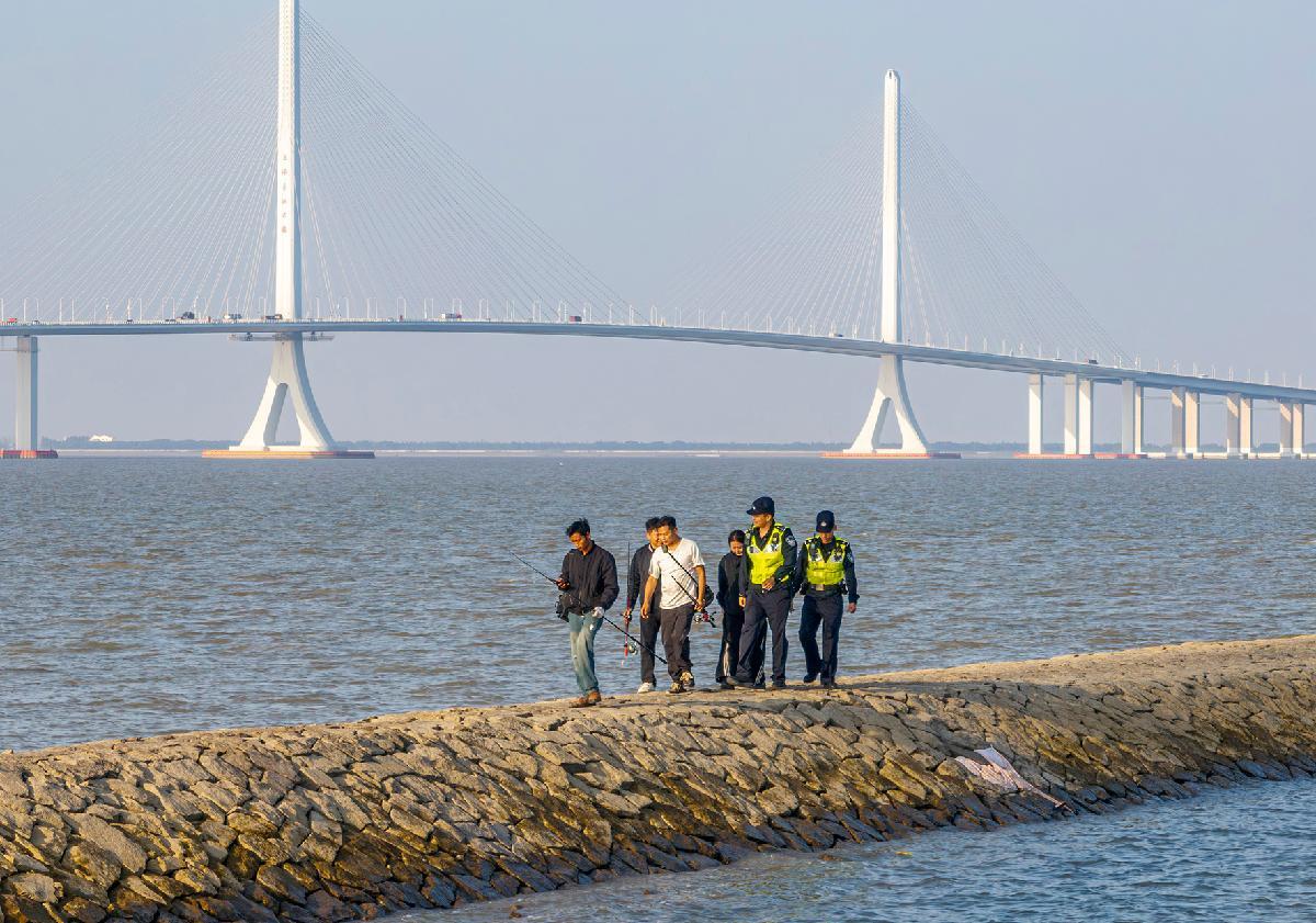 11月16日,上海市公安局崇明分局長(zhǎng)興派出所民警勸離存在安全隱患的江堤丁字壩上的游客。