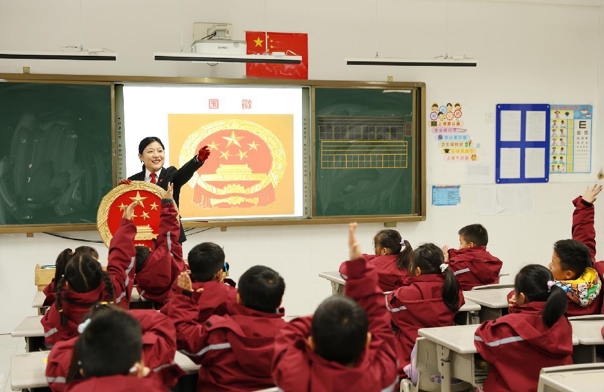 12月2日,在江蘇省連云港市墟溝小學,連云港市公安局墟溝派出所民警為學生講解憲法知識。