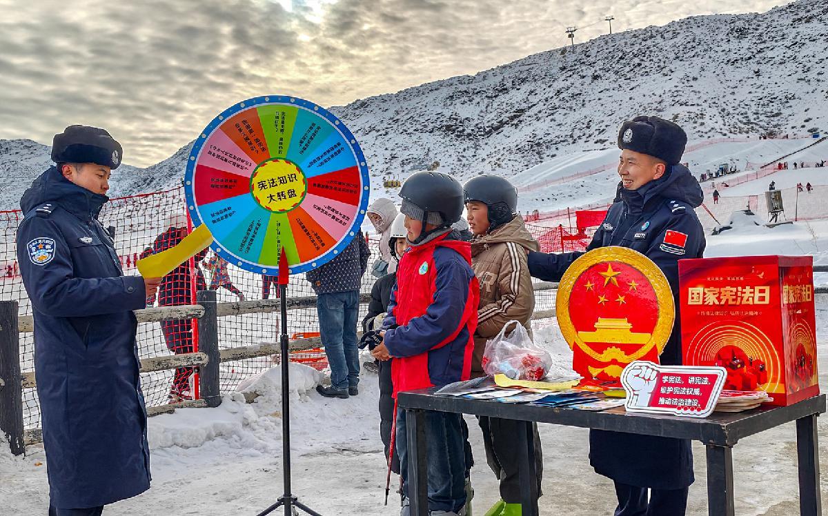 在第十二個國家憲法日來臨之際,12月1日,新疆阿勒泰邊境管理支隊阿熱勒托別邊境派出所來到阿勒泰地區(qū)青河縣“狼山國際滑雪場”開展憲法宣傳。