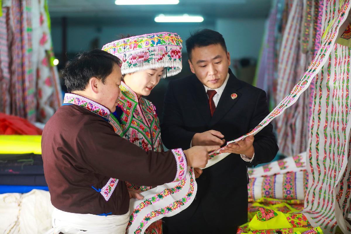 1月7日,貴州省黔西市檢察院檢察干警深入轄區(qū)鐵石苗族彝族鄉(xiāng),走訪當?shù)丶彝プ鞣坏拿缋C產(chǎn)業(yè),向苗繡同胞宣傳工藝技法、品牌標識等保護及維權知識。