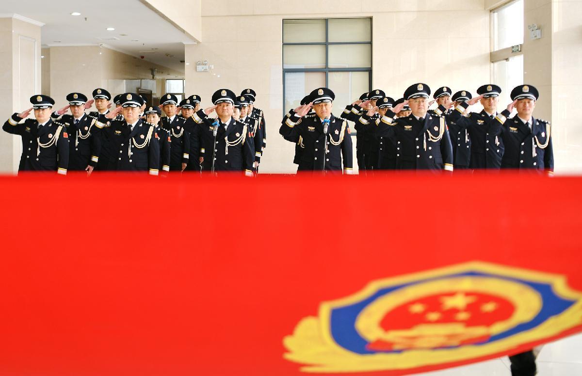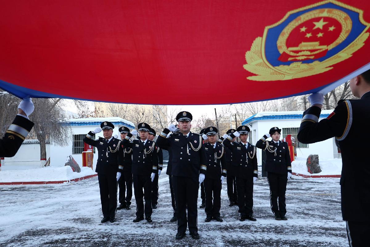 1月10日,新疆阿勒泰邊境管理支隊(duì)吉木乃邊境管理大隊(duì)舉行升警旗儀式,重溫入警誓詞。