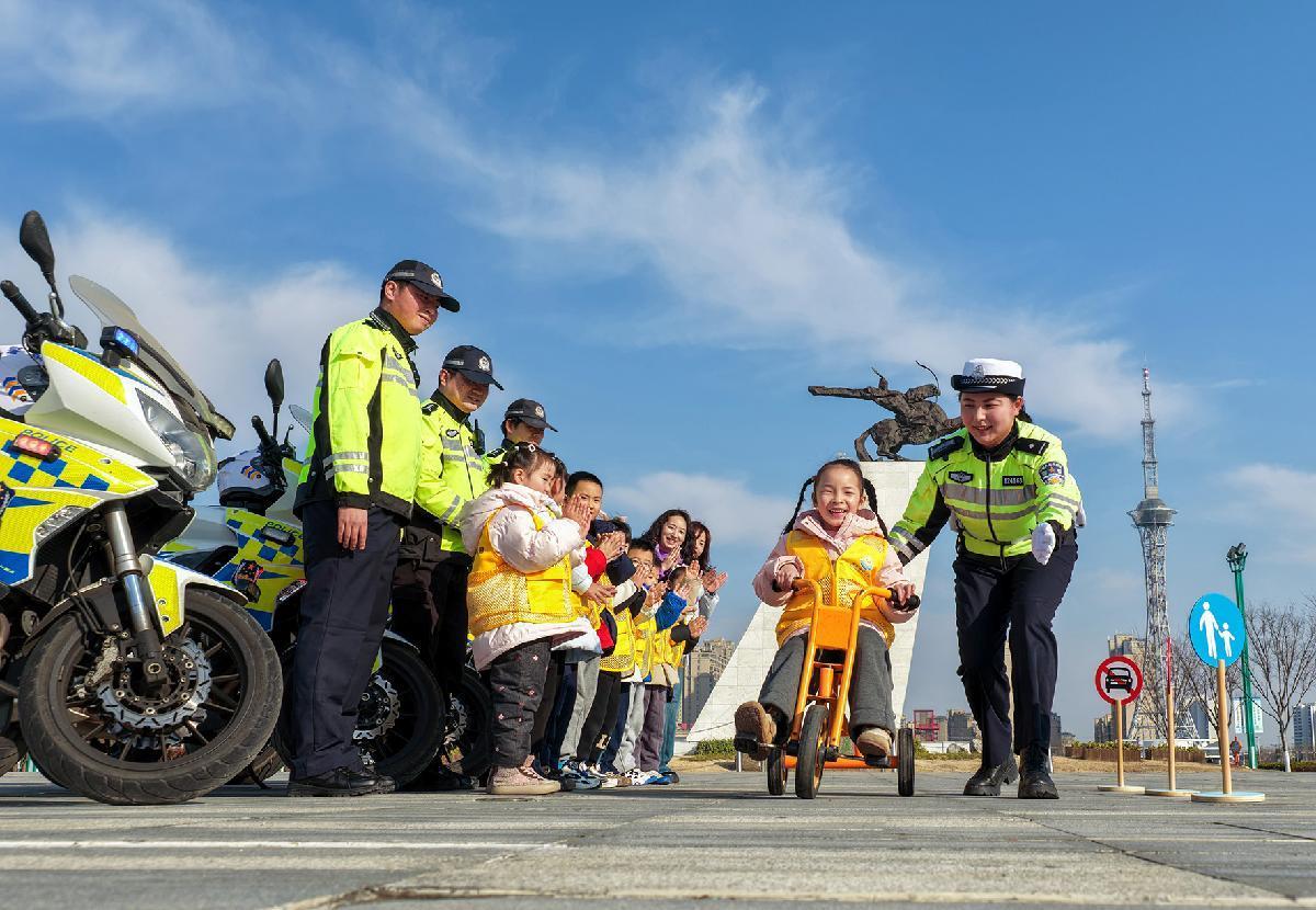 1月10日,江蘇省興化市公安局交管大隊(duì)民警通過(guò)游戲互動(dòng)的方式向小朋友們講解交通安全知識(shí)。