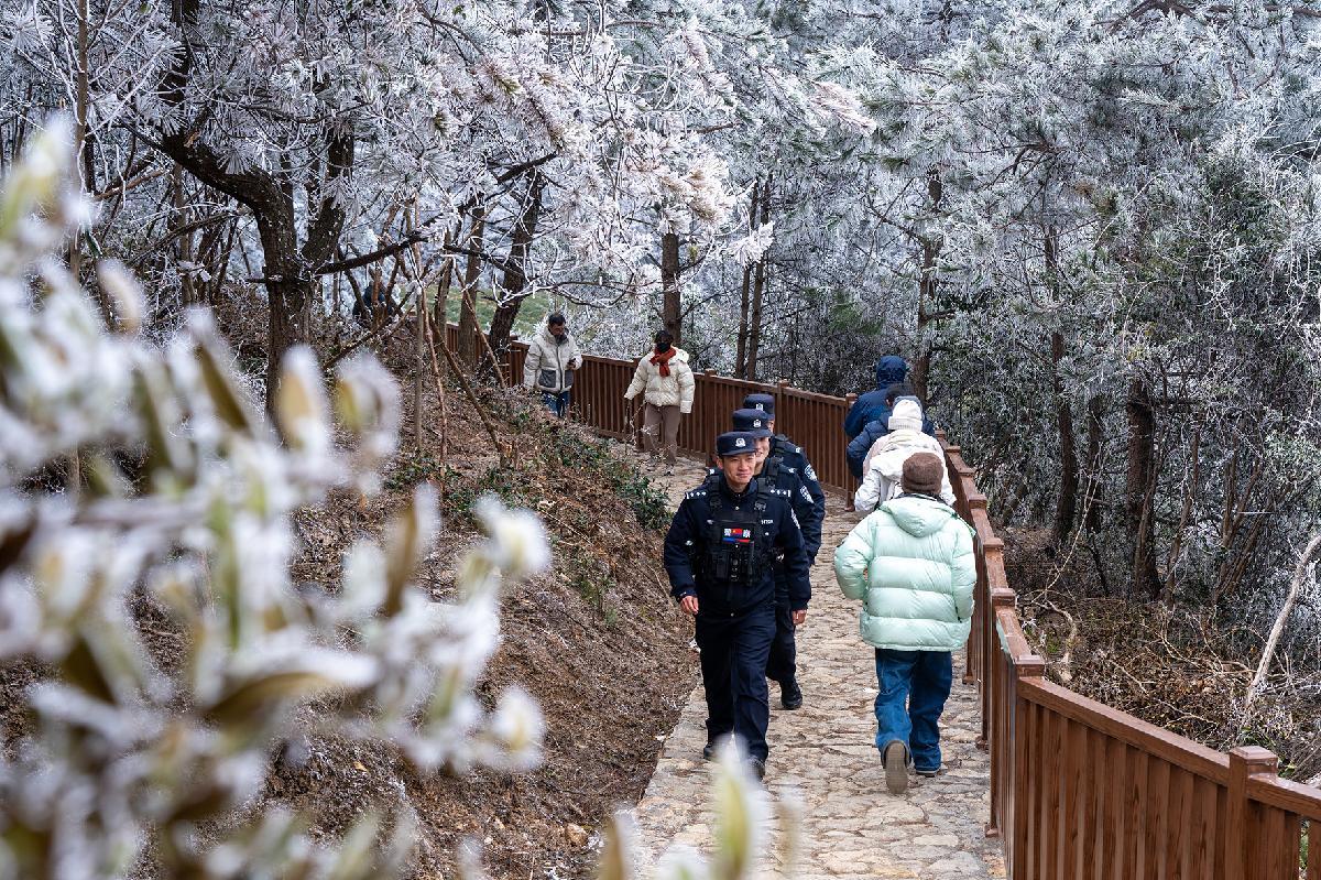 1月22日,受寒潮影響,浙江省臺(tái)州市黃巖區(qū)大寺基林區(qū)出現(xiàn)壯美的霧凇景觀(guān),吸引了大批游客。臺(tái)州市公安局黃巖分局寧溪派出所加強(qiáng)林區(qū)的巡邏防控,服務(wù)群眾,確保游客平安出行。