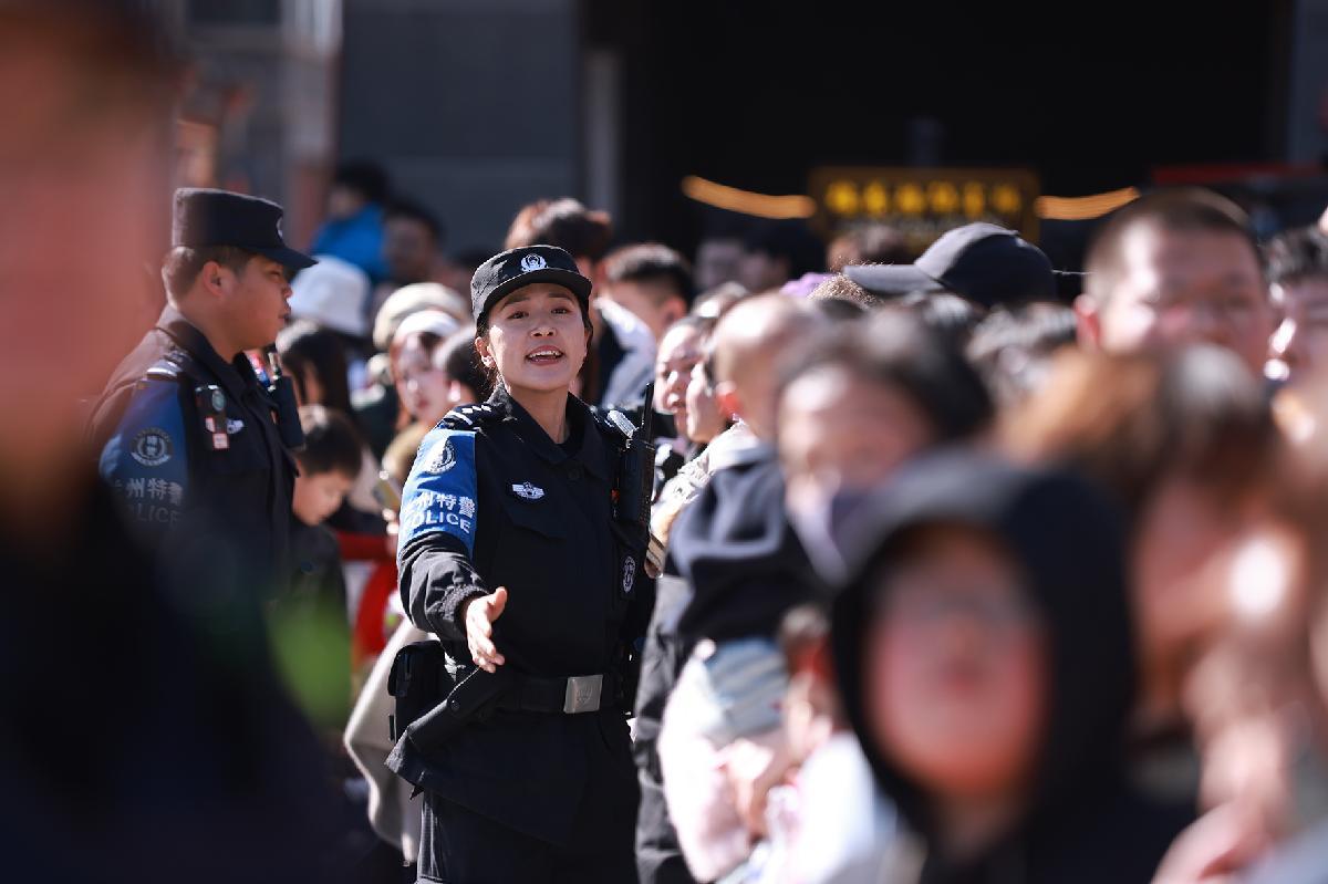 2月20日,甘肅省蘭州市公安局民輔警在蘭州老街非遺踩高蹺表演現(xiàn)場疏導(dǎo)客流、維護秩序。