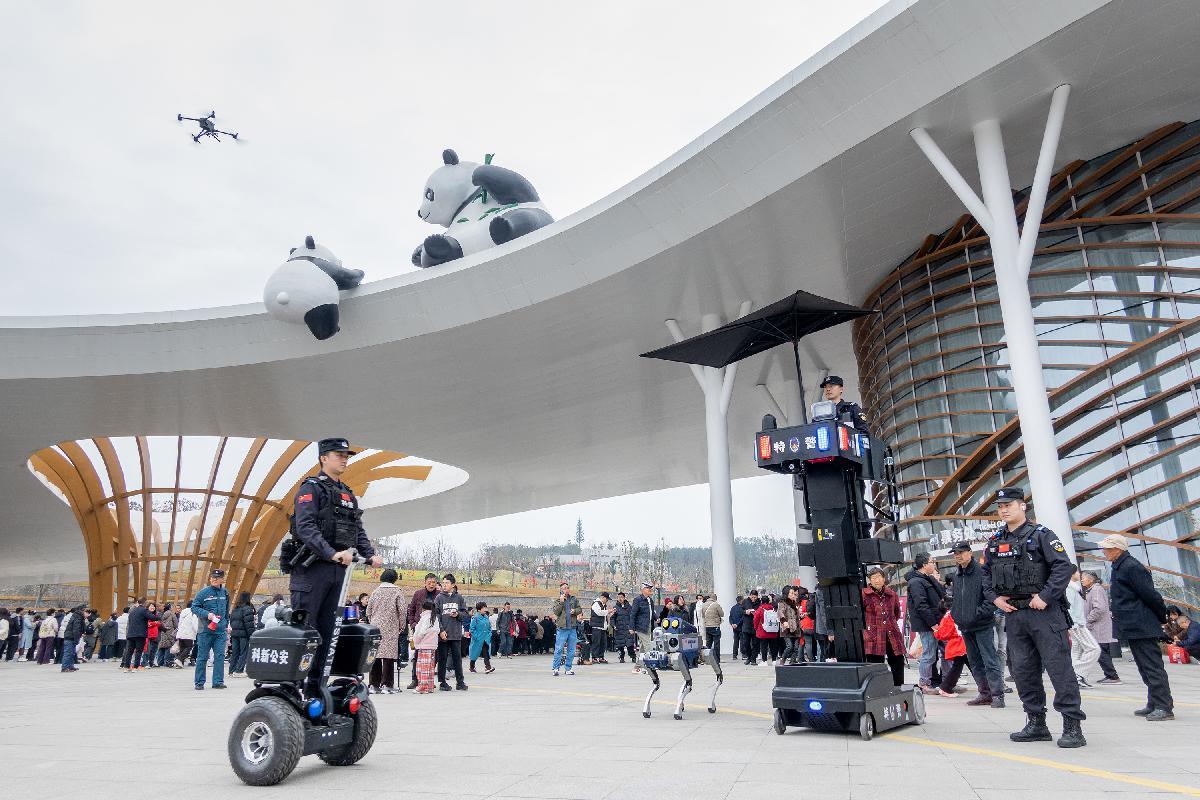 2月18日,四川省綿陽市公安局科技城新區(qū)分局民輔警在綿陽中華大熊貓苑前廣場值守。