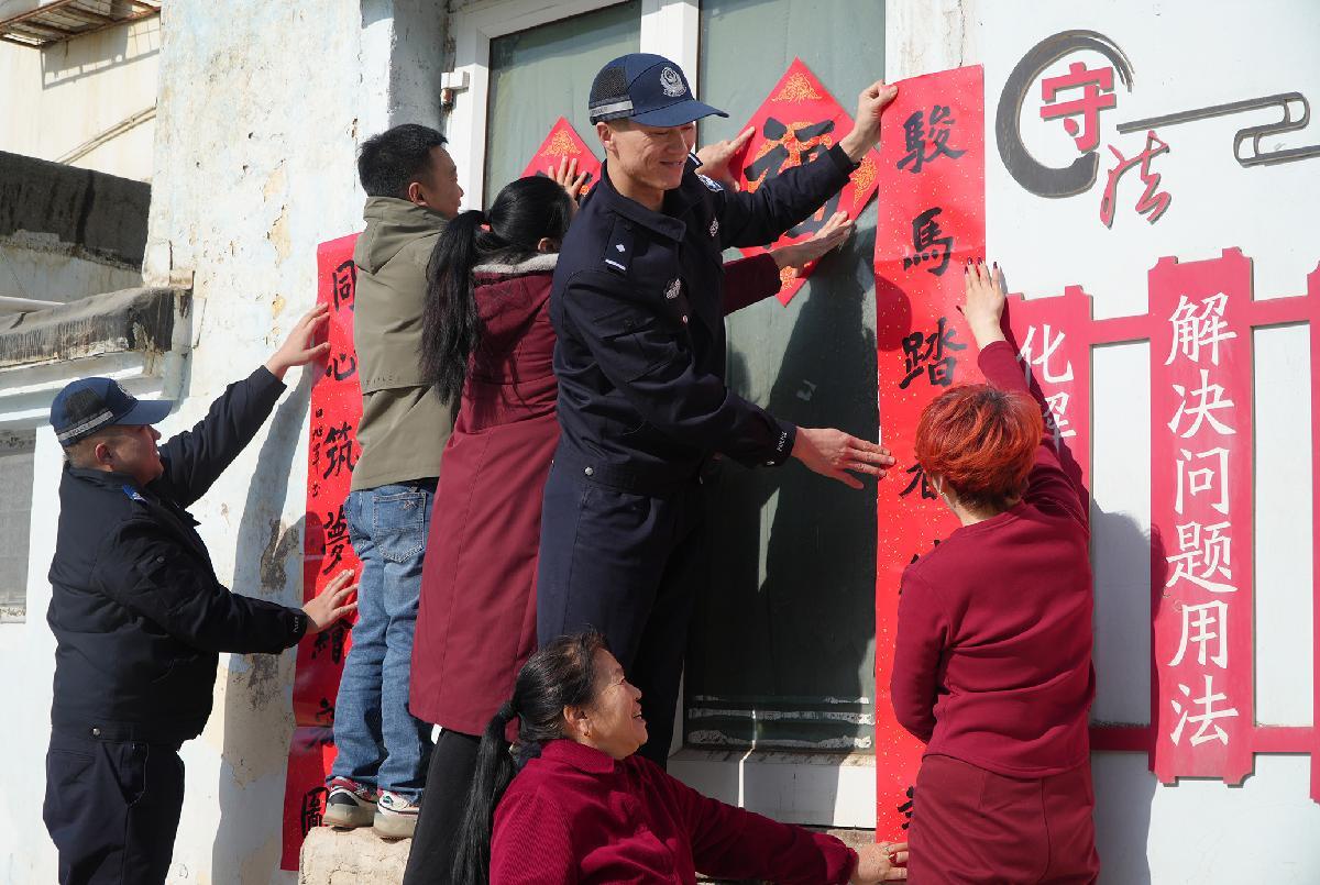 2月16日,新疆維吾爾自治區(qū)克拉瑪依市公安局白堿灘區(qū)分局民輔警與中興路街道五新社區(qū)群眾一起張貼春聯(lián)。
