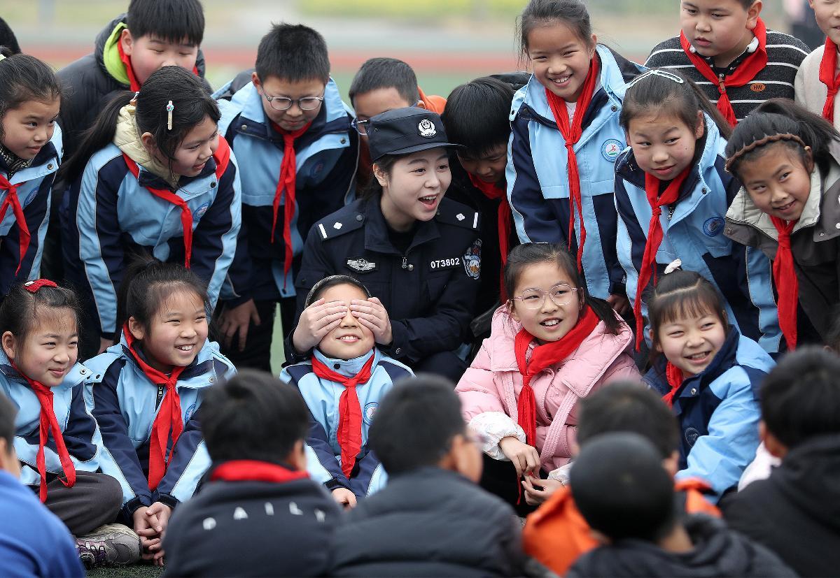 3月5日,在湖北省沙洋縣漢上實(shí)驗(yàn)學(xué)?!瓣?yáng)光大課間”活動(dòng)現(xiàn)場(chǎng),沙洋縣公安局女民警通過(guò)“猜猜我是誰(shuí)”游戲,為同學(xué)們普及實(shí)用的反詐防騙知識(shí)。