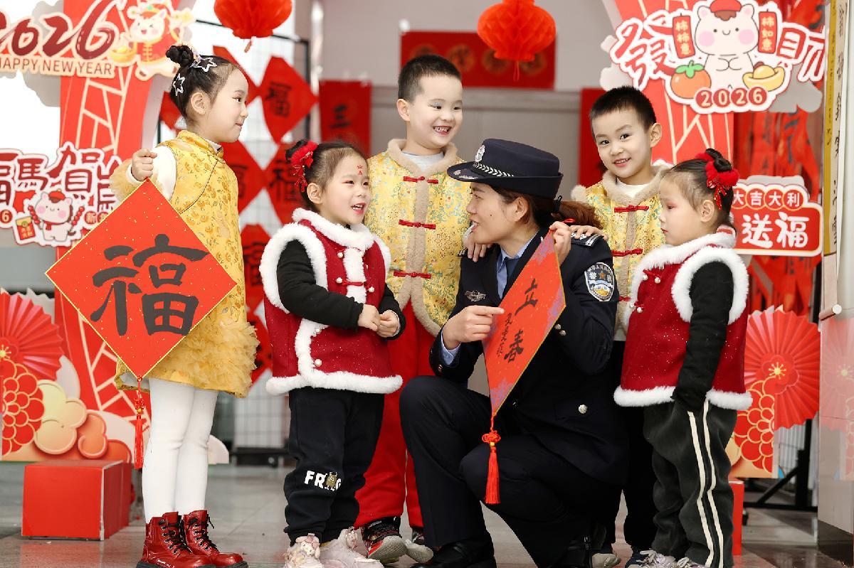 2月4日,山東省滕州市公安局民警走進(jìn)安居小學(xué)“春聯(lián)小屋”,與孩子們共同開展迎新春送?;顒?。