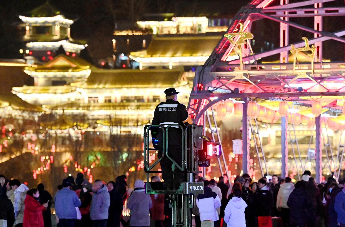 2月15日晚,甘肅省蘭州市公安局城關(guān)分局第三治安派出所中山橋警務(wù)站民輔警在蘭州中山橋景點(diǎn)值守。