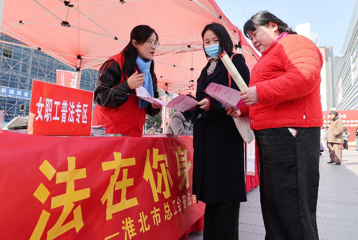 3月13日,安徽省淮北市總工會組織普法志愿者在就業(yè)招聘會現(xiàn)場向廣大女職工宣傳法律知識。