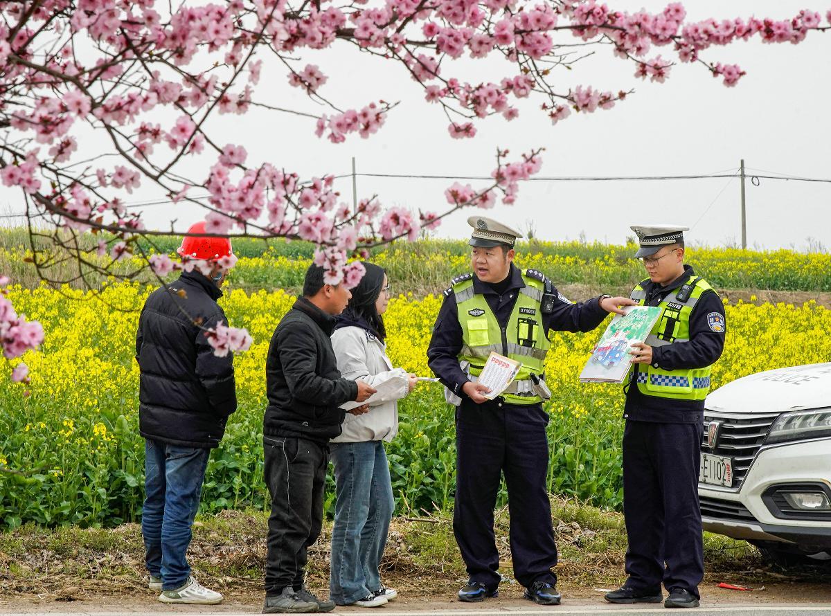 3月16日,安徽省和縣公安局交管大隊民警為公路沿線群眾宣講春耕時節(jié)交通安全注意事項。