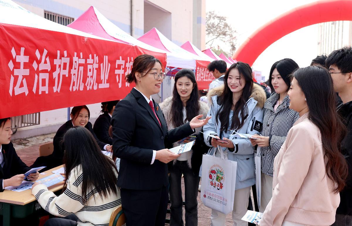 3月21日,山東省棗莊市市中區(qū)人民法院法官在棗莊學院2026年春季雙選會招聘活動現(xiàn)場,向求職大學生們宣傳勞動用工相關法律法規(guī)。