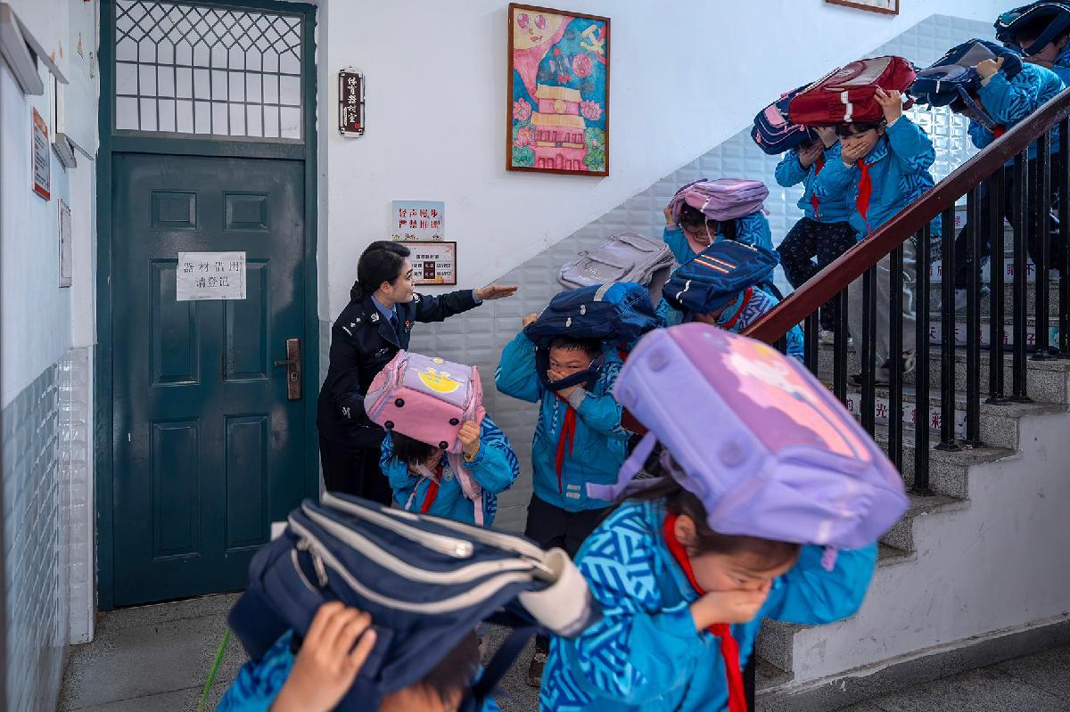 3月30日,是第31個全國中小學(xué)生安全教育日。山東省棗莊市市中區(qū)東湖小學(xué)學(xué)生在消防救援人員的引導(dǎo)下進(jìn)行校車應(yīng)急逃生演練活動。
