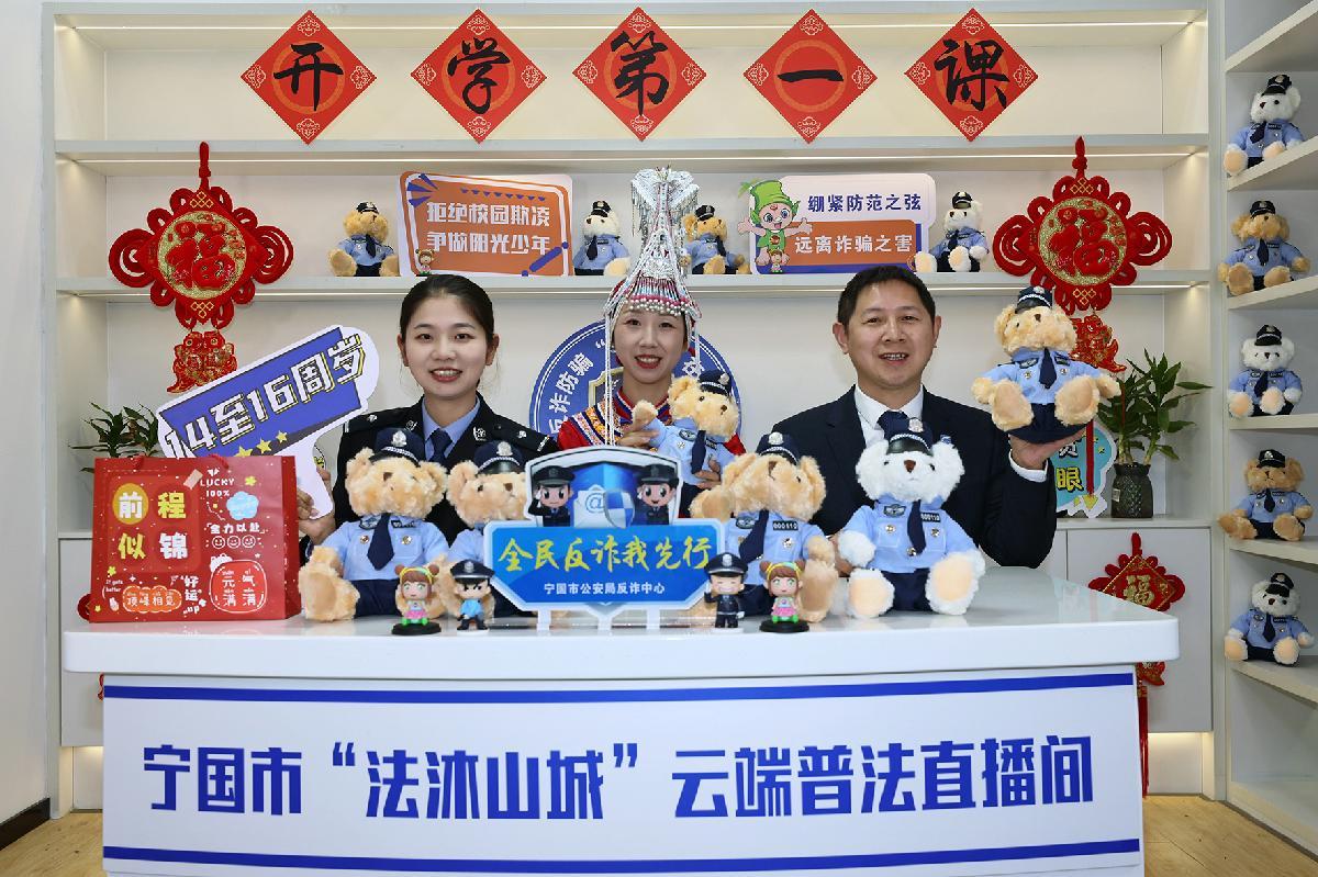 2月28日,安徽省寧國市公安、司法、教體局聯(lián)合開展網(wǎng)絡直播“開學第一課”活動,反詐中心民警、畬族鄉(xiāng)“法律明白人”及公益律師圍繞反詐、防欺凌等內(nèi)容進行宣傳。