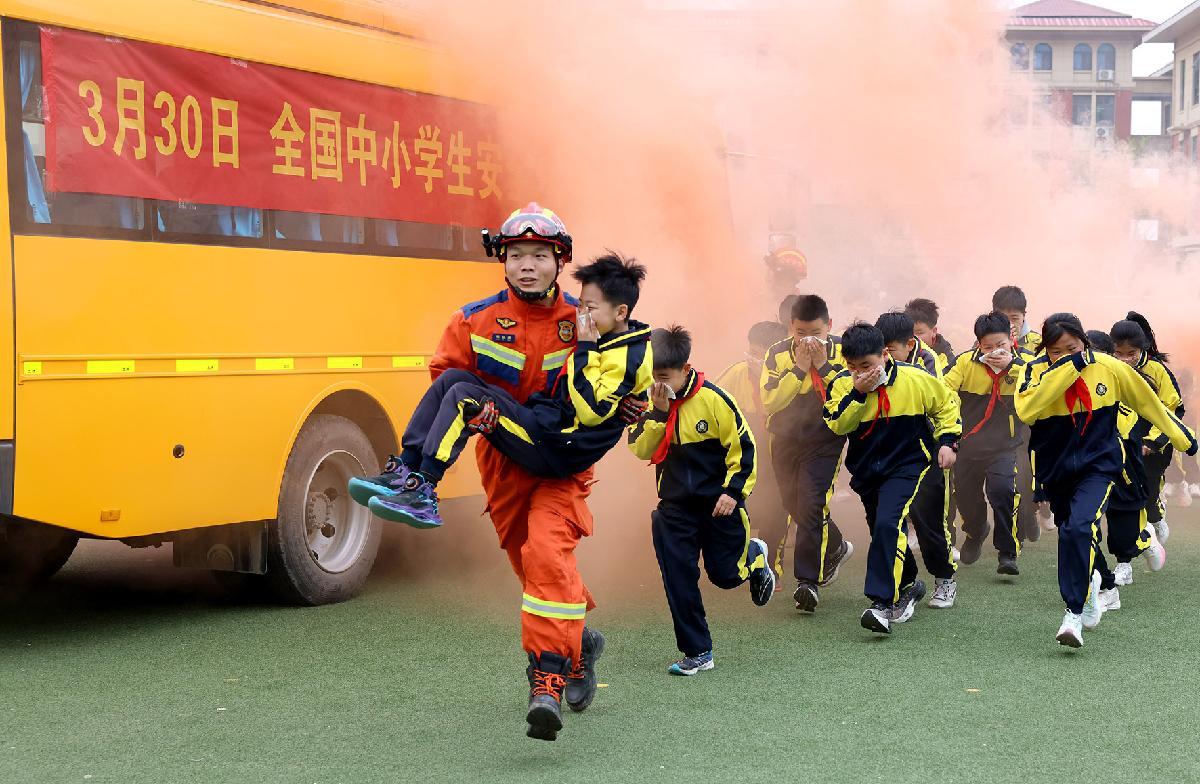 3月30日,是第31個全國中小學生安全教育日。山東省棗莊市市中區(qū)東湖小學學生在消防救援人員的引導下進行校車應急逃生演練。