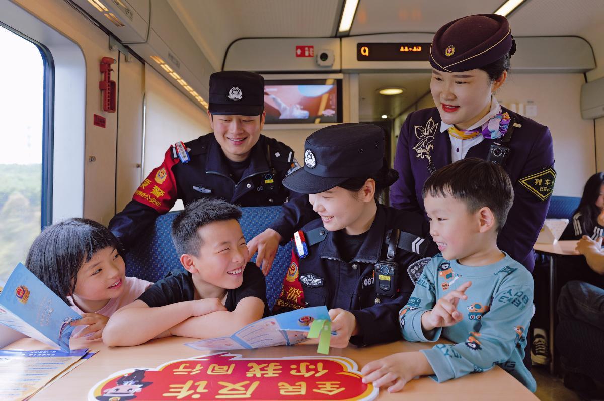 4月9日,在上海鐵路公安局杭州乘警支隊(duì)值乘的D2246次列車上,乘警與列車長(zhǎng)主動(dòng)為三名剛從英國(guó)返鄉(xiāng)探親、首次體驗(yàn)乘坐高鐵的兒童講解列車安全知識(shí),在溫馨的氣氛中守護(hù)旅途平安。