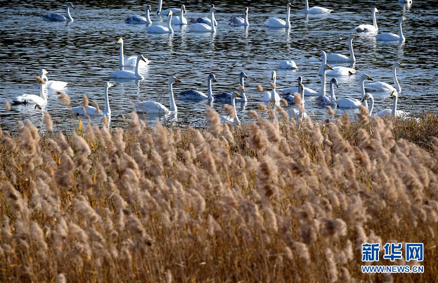 白天鵝在三門峽天鵝湖國家城市濕地公園棲息(11月14日攝)。新華社記者 李安 攝
