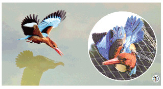 圖① 白胸翡翠落入捕鳥人的“死亡之網(wǎng)”。白胸翡翠已被列入《世界自然保護(hù)聯(lián)盟》2015年瀕危物種紅色名錄ver 3.1無危(LC)。 本報(bào)記者 鄧新建 攝