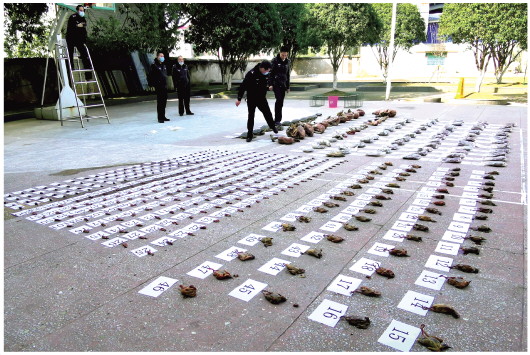 ▲ 1月23日至2月28日,湖南省森林公安機(jī)關(guān)共辦理涉及野生動(dòng)物的刑事案件93起,抓獲犯罪嫌疑人97名,收繳野生動(dòng)物5606頭(只)。圖為民警在清理繳獲的竹鼠、野豬、斑鳩等野生動(dòng)物尸體。 本報(bào)記者 阮占江 本報(bào)通訊員 顏英華 攝