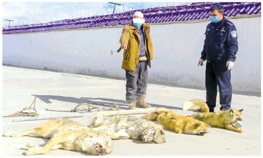 ▲ 3月2日,新疆維吾爾自治區(qū)克州邊境管理支隊(duì)木吉邊境派出所快速破獲一起捕殺販賣野生動(dòng)物案,查獲已被獵殺的兩只狼、兩只狐貍。 本報(bào)記者 潘從武 本報(bào)通訊員 張佳 吳明賢 攝