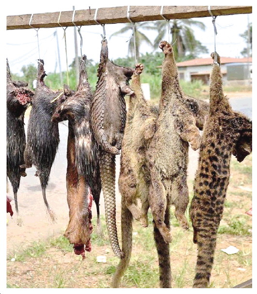 ▲ 野生動(dòng)物被殘忍獵殺后,又被掛起來販賣。 (資料圖片)