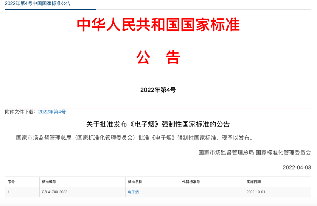 據(jù)國家標(biāo)準(zhǔn)化管理委員會官方網(wǎng)站消息,近日,國家市場監(jiān)督管理總局、國家標(biāo)準(zhǔn)化管理委員會批準(zhǔn)《電子煙》強制性國家標(biāo)準(zhǔn),現(xiàn)予以發(fā)布,自2022年10月1日起實施。