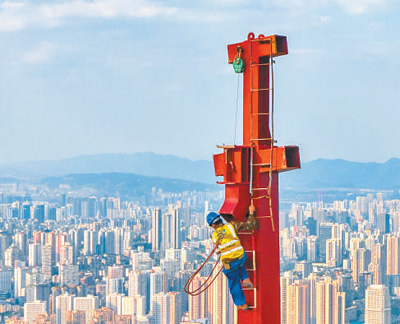 施工人員在重慶陸海國際中心項目主塔樓樓頂進行施工作業(yè)。