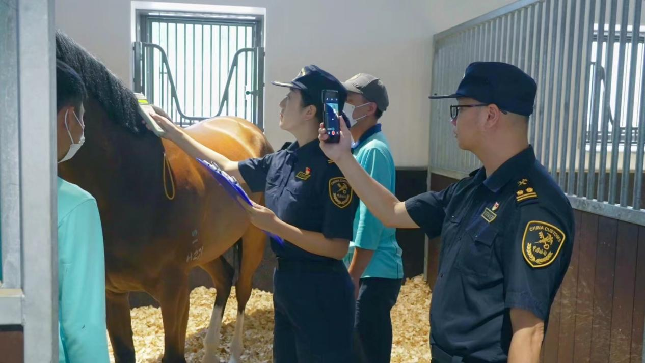 圖為:廣州海關(guān)所屬從化海關(guān)關(guān)員通過掃描馬匹芯片核對出境馬匹身份信息。