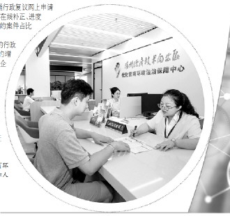 圖為揚(yáng)州市經(jīng)濟(jì)技術(shù)開(kāi)發(fā)區(qū)優(yōu)化營(yíng)商環(huán)境法治保障中心行政復(fù)議聯(lián)系點(diǎn)窗口工作人員為企業(yè)工作人員辦理復(fù)議申請(qǐng)。 揚(yáng)州市司法局供圖