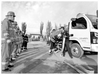 圖為新疆阿克蘇地區(qū)消防救援支隊消防救援人員正在對沙雅縣托依堡勒迪鎮(zhèn)政府專職消防隊隊員進(jìn)行業(yè)務(wù)技能培訓(xùn)。