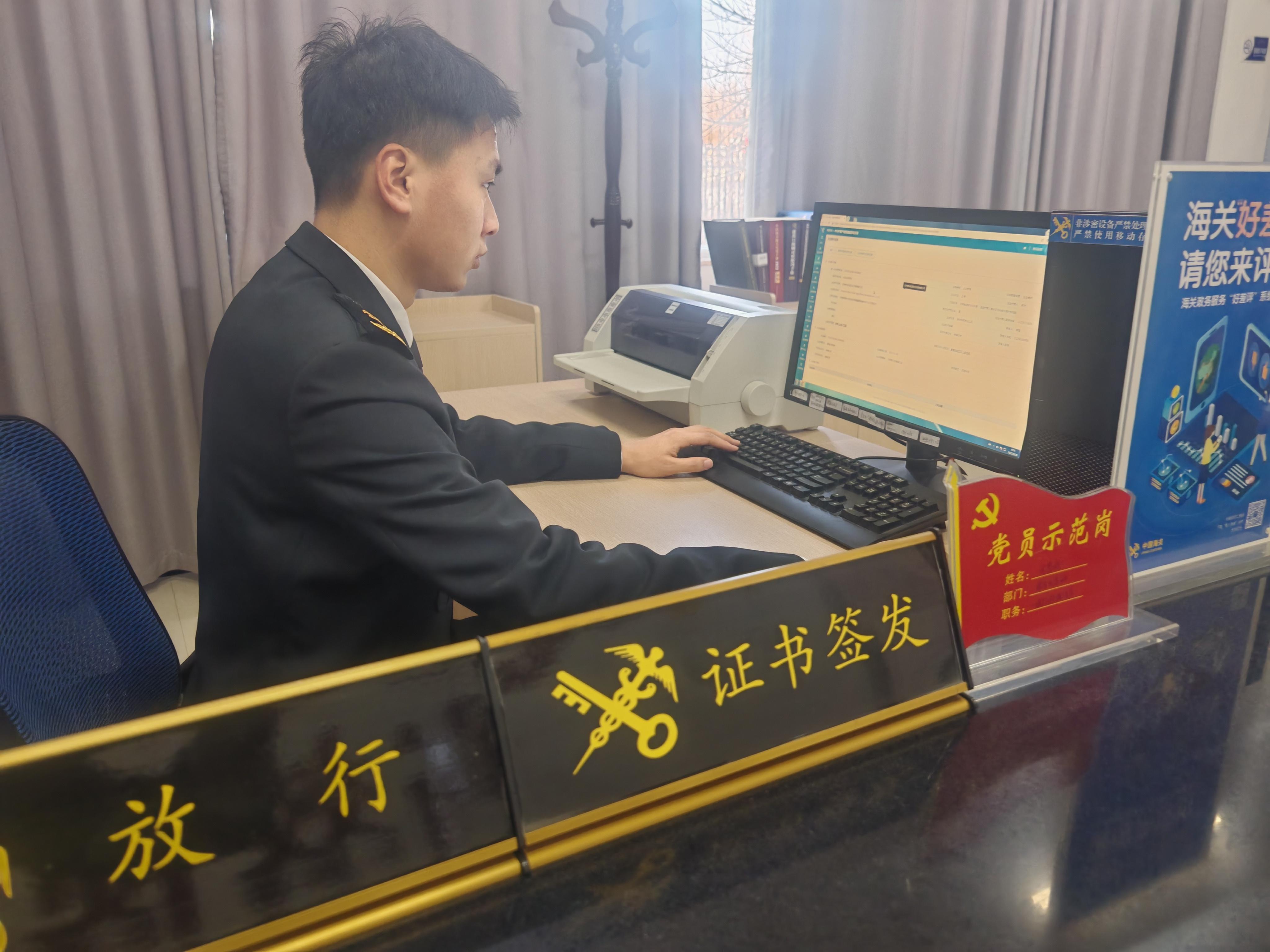 “我們通過電腦端發(fā)出申請,海關工作人員在線審核后我們即可自助打印證書并及時郵遞給國外客戶,不用親自去海關辦事窗口,節(jié)省了至少1天的時間和往返300多公里的工作成本,我們衷心為海關推出的‘企業(yè)自助打印業(yè)務’點贊?!惫现莺率狭5擂r(nóng)業(yè)發(fā)展有限責任公司負責人郝宇說。