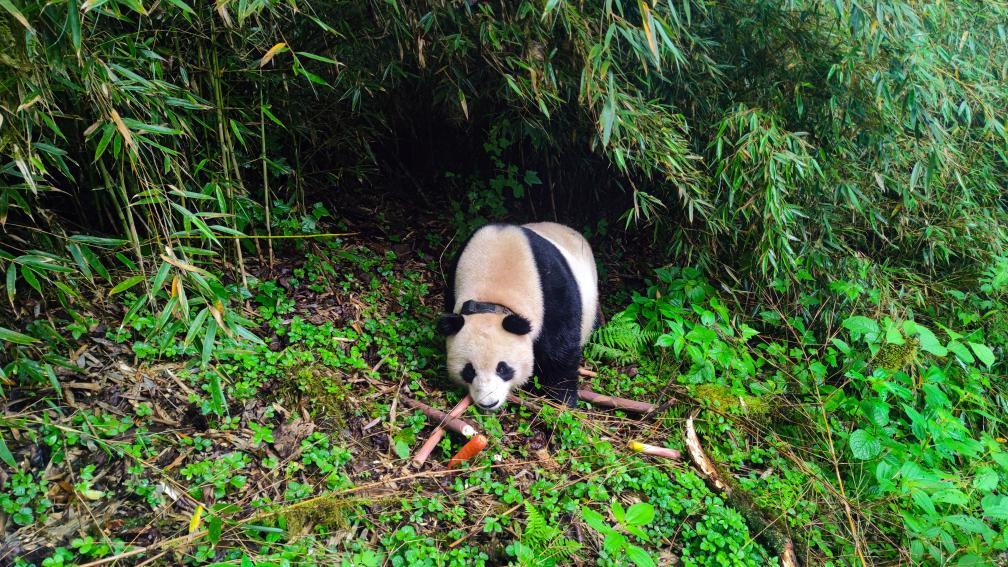 在位于大熊貓國家公園臥龍片區(qū)內(nèi)天臺山的大熊貓第二階段野化培訓場內(nèi),雌性熊貓“輝輝”準備吃投喂的竹筍和胡蘿卜(2024年6月9日攝)。新華社發(fā)(牟仕杰 攝)