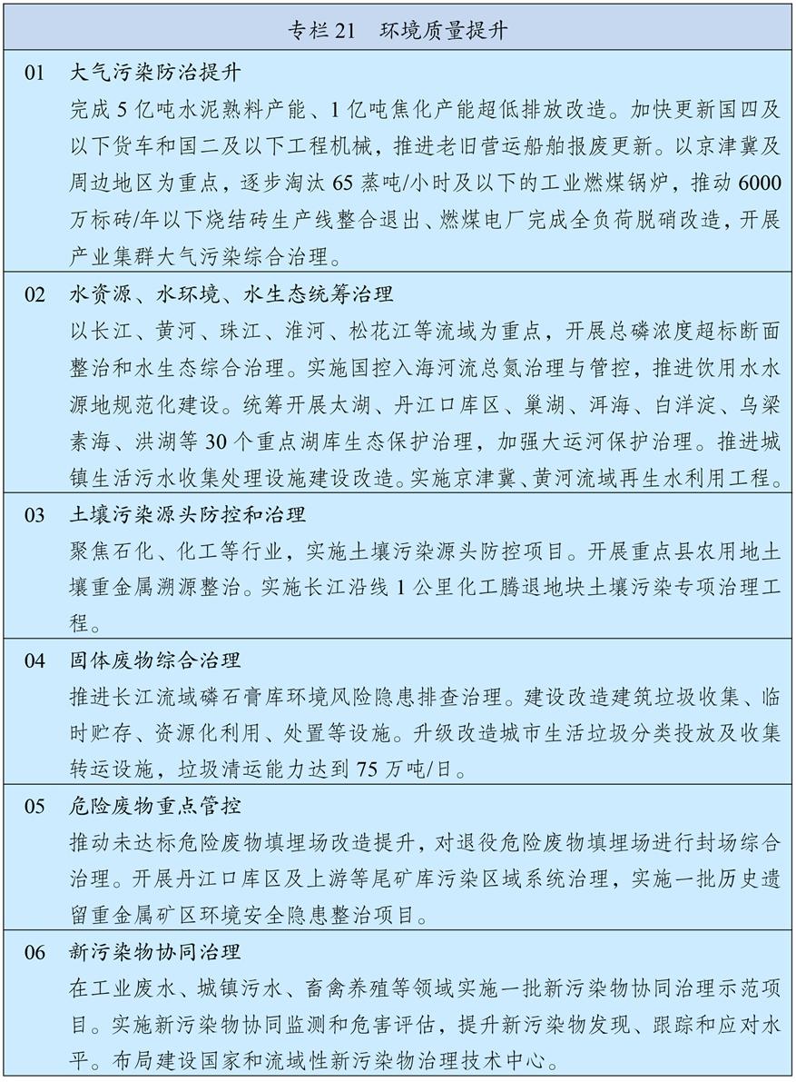 持續(xù)深入推進污染防治攻堅,以更高標準改善大氣、水、土壤環(huán)境質(zhì)量。以京津冀及周邊、長三角、汾渭平原等重點區(qū)域為主戰(zhàn)場,強化細顆粒物(PM2.5)控制,深入推進重點行業(yè)超低排放改造,推動揮發(fā)性有機物源頭替代和全流程治理,制定下一階段機動車排放和油品質(zhì)量標準,深化大氣環(huán)境績效分級管理,氮氧化物、揮發(fā)性有機物排放量分別下降8%以上,進一步消除重污染天氣。加強長江中游、成渝等區(qū)域大氣污染防治。加強餐飲油煙、惡臭異味和環(huán)境噪聲污染治理。統(tǒng)籌水資源、水環(huán)境、水生態(tài)治理,以解決全流域和跨省界突出問題為重點,加強重要江河湖庫系統(tǒng)治理和生態(tài)保護,基本完成重點流域海域入河入海排污口排查整治,化學需氧量、總磷排放量分別下降6%,鞏固城市黑臭水體治理成效、基本消除縣鄉(xiāng)黑臭水體。加強土壤污染源頭防控,推進受污染耕地、建設(shè)用地安全利用。