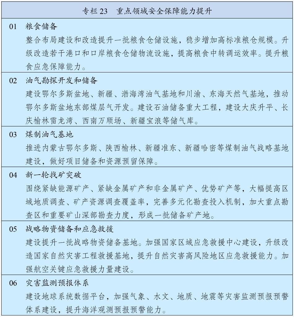 堅持立足國內(nèi)、補齊短板、多元保障、強化儲備,加強能源產(chǎn)供儲銷體系建設(shè)。堅持油氣核心需求自主保障,實施中長期油氣增儲上產(chǎn)戰(zhàn)略行動,確保原油年產(chǎn)量穩(wěn)定在2億噸左右、天然氣產(chǎn)量穩(wěn)步增長,加強煤制油氣產(chǎn)能和技術(shù)儲備。強化政府儲備和企業(yè)儲備協(xié)同,提升國家石油儲備規(guī)模,建立更加靈活的輪換動用機制,增強天然氣儲備調(diào)節(jié)保障能力,完善煤炭儲備體系。健全能源保供中長期合同制度,完善電力應急調(diào)度機制和備用電源配置,強化能源需求側(cè)管理。加強戰(zhàn)略性礦產(chǎn)資源勘探開發(fā)和儲備,深入實施新一輪找礦突破戰(zhàn)略行動,統(tǒng)籌加強產(chǎn)品、產(chǎn)能和產(chǎn)地儲備,推動大宗商品儲運基地建設(shè),提升戰(zhàn)略性礦產(chǎn)資源安全風險監(jiān)測預警和應急保供水平。加強能源資源開發(fā)國際合作,維護戰(zhàn)略通道安全。