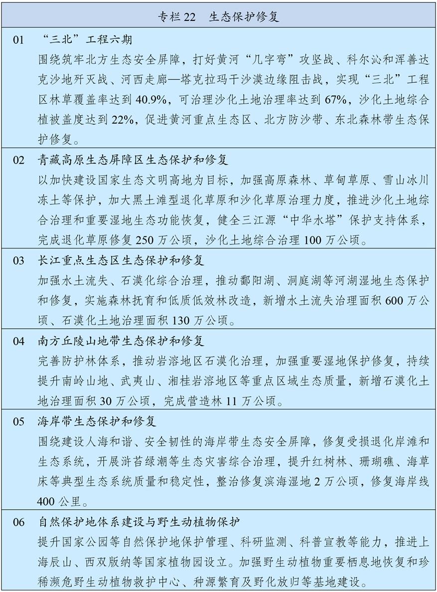 統(tǒng)籌推進重要生態(tài)系統(tǒng)保護和修復重大工程,持續(xù)鞏固以“三區(qū)四帶”為骨架的國家生態(tài)安全屏障體系。打好“三北”工程攻堅戰(zhàn),推動三大標志性戰(zhàn)役取得決定性勝利。深入推進青藏高原生態(tài)保護,加強重點區(qū)域水土流失治理和石漠化治理??茖W開展大規(guī)模國土綠化行動,推進森林質(zhì)量精準提升和國家儲備林建設(shè),森林蓄積量達到224億立方米,統(tǒng)籌草原生態(tài)修復與合理利用,加強濕地保護修復。推進超引地表水和超采地下水治理,開展歷史遺留廢棄礦山生態(tài)修復。