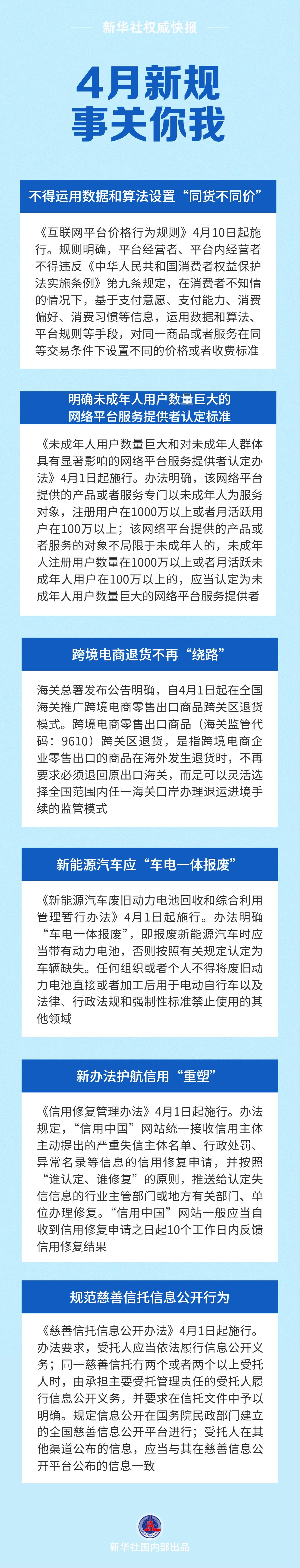 不得運(yùn)用數(shù)據(jù)和算法設(shè)置“同貨不同價(jià)”;明確未成年人用戶數(shù)量巨大的網(wǎng)絡(luò)平臺(tái)服務(wù)提供者認(rèn)定標(biāo)準(zhǔn);跨境電商退貨不再“繞路”……4月新規(guī),事關(guān)你我,一起來(lái)看。
