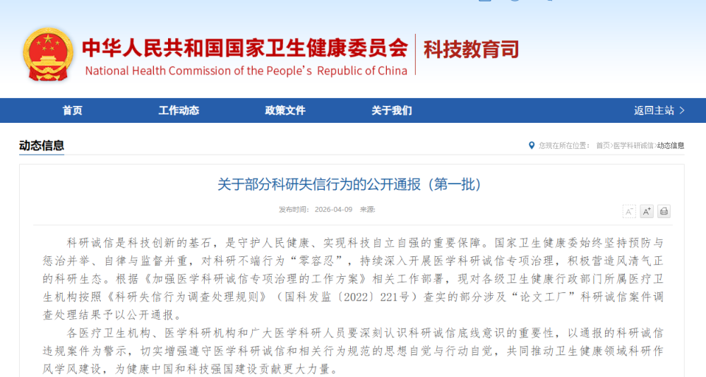 科研誠信是科技創(chuàng)新的基石,是守護(hù)人民健康、實(shí)現(xiàn)科技自立自強(qiáng)的重要保障。國家衛(wèi)生健康委始終堅(jiān)持預(yù)防與懲治并舉、自律與監(jiān)督并重,對科研不端行為“零容忍”,持續(xù)深入開展醫(yī)學(xué)科研誠信專項(xiàng)治理,積極營造風(fēng)清氣正的科研生態(tài)。根據(jù)《加強(qiáng)醫(yī)學(xué)科研誠信專項(xiàng)治理的工作方案》相關(guān)工作部署,現(xiàn)對各級衛(wèi)生健康行政部門所屬醫(yī)療衛(wèi)生機(jī)構(gòu)按照《科研失信行為調(diào)查處理規(guī)則》(國科發(fā)監(jiān)〔2022〕221號)查實(shí)的部分涉及“論文工廠”科研誠信案件調(diào)查處理結(jié)果予以公開通報(bào)。